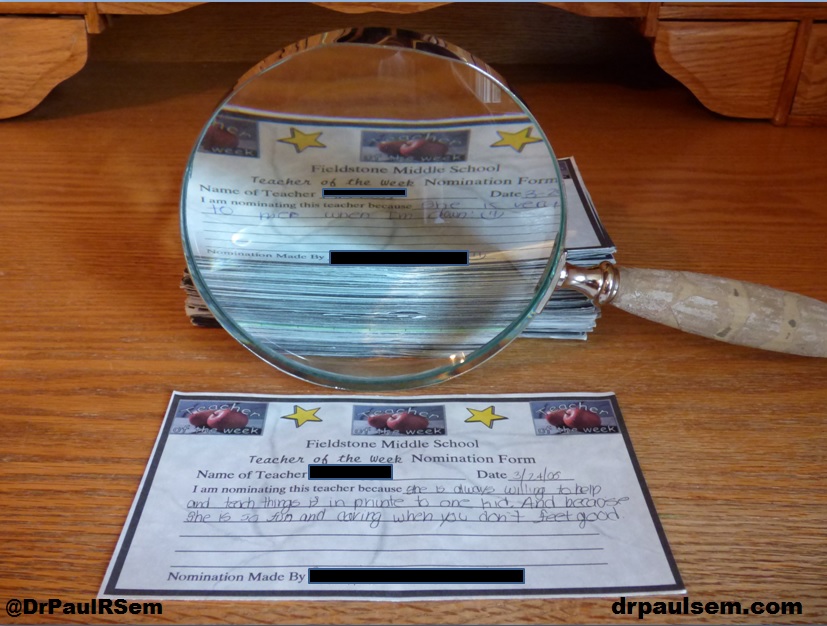 Last week, I was cleaning my current office. One of my favorite summer tasks is taking the time to reorganize myself as I prepare for the upcoming school year. It’s been a somewhat quiet summer so I had a few hours to spend on organizing my paperwork and in going through old files. As I did this, I came upon the old nomination forms from the “Teacher of the Week” program from all those years ago. I had saved them as a memory of what good teaching looks like to middle school kids.